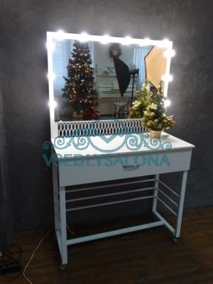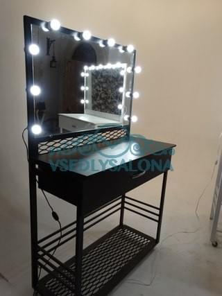 В стол можно установить встроенную вытяжку, на поверхности столешницы достаточно места для УФ-лампы, подставки для лаков, настольной лампы и прочего. В дизайне использована фирменная каретная стяжка, цвет которой, как и ДСП, можно выбрать индивидуально под свои требования.