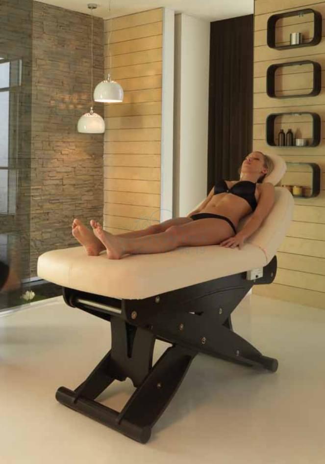 Кушетка имеет интересный дизайн – ее каркас изготовлен из натуральной древесины, которая декорирована вставками из алюминия. Матрас отличается эргономичной формой и комплектуется американским подголовником. За счет этого пациент может расположиться максимально удобно. Кушетка изготовлена по последним разработкам производителя.