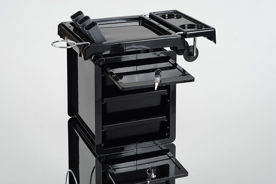 Компактная многофункциональная парикмахерская тележка "QA0013" выполнена из прочного пластика, стойкого к воздействию косметических красок, а прорезиненные колеса обеспечивают легкое и бесшумное передвижение тележки. Столешница поделена на секции и имеет специальные стаканы для горячих ножниц и выпрямителей. Тележка оснащена внешним держателем для фена и специальным держателем для фольги. Для хранения инструментов предусмотрены шесть выдвижных ящиков, которые, при необходимости, легко вынимаются и надежно фиксируются на столешнице. Секции с ящиками запираются на ключ. Для каждой секции предусмотрен свой ключ, что делает возможным использование тележки QA0013 сразу на два рабочих места парикмахера. На нижней платформе можно разместить высокие емкости, хромированные бортики надежно фиксируют бутыли и не позволяют им упасть.