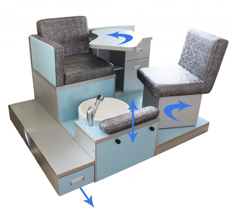 Пожалуй одним из основных желаний мастеров как маникюра, так и педикюра, остается желание чтобы все необходимое всегда было под рукой. Желание многих можно осуществить с СПА-комплексом «Руфик». Это не только комфортабельное место для клиента, но и удобное расположение всех инструментариев и приборов для мастера. При  наличии такого комплекса совершенно не нужно переживать об устройстве уголка маникюра или педикюра, поскольку он объединяет все это в себе. Такой СПА-комплекс можно считать полноценной комнатой красоты. Здесь и удобный столик для маникюра с максимальным комфортом расположен как к клиенту, так и к мастеру, и все необходимое для педикюра. Также, помимо прочего, есть несколько миниатюрных ящичков для необходимого инвентаря в работе. Кресло клиента также избирательно учитывалось при планировке, оно повернуто таким образом, чтобы обеспечить максимальный доступ и для маникюра и для педикюра.