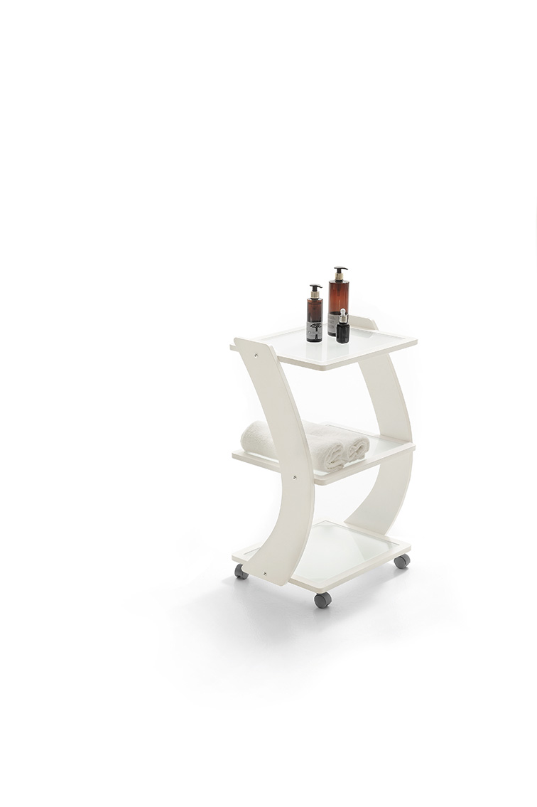 Полки выполнены в форме квадратного поддона и подходят как для хранения различных СПА-средств, так и полотенец. Производителем предусмотрены колесики, за счет которых тележку можно легко перемещать. Модель отличается надежностью, износоустойчивостью и долговечностью.
