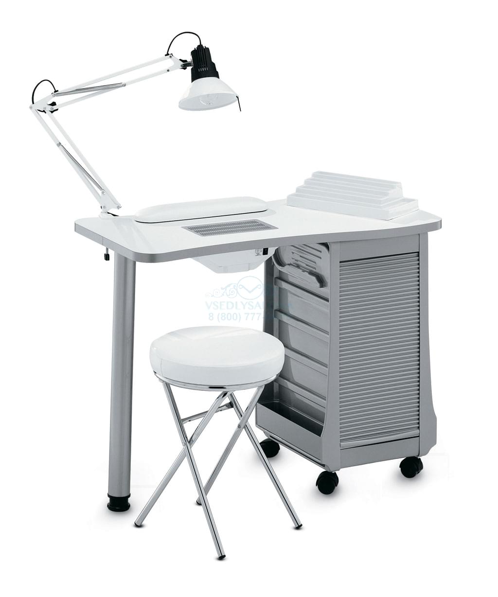 Маникюрный стол с вытяжкой, одной тумбой и белой ламинированной столешницей. Тумба пластиковая на колесах с выдвижными ящиками. В комплекте: лампа, подушка для маникюра, подставка для лаков. Размер: 98х48x74