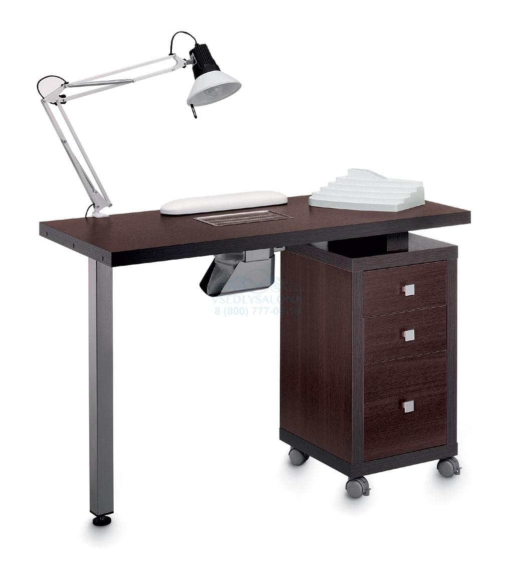 Маникюрный стол с вытяжкой, одной тумбой и ламинированной столешницей белого цвета или цвета венге. Тумба выполнена из ДСП, оснащена четырьмя выдвижными ящиками и колесами. В комплекте: лампа, подушка для маникюра, подставка для лаков. Размер: 115х50x79