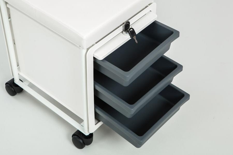 Стойка маникюрная CIAK MANICURE COLOR – не только небольшого размера, но и вместительная, выполнена в приятных бежевых тонах. Основной материал изготовления – пластик, но сидение обтянуто искусственной кожей отменного качества, что говорит о комфорте. Для хранения вещей и инструментов предусмотрено три выдвижных ящика, а регулируемая по высоте полочка позволит выполнять работу удобно и быстро.