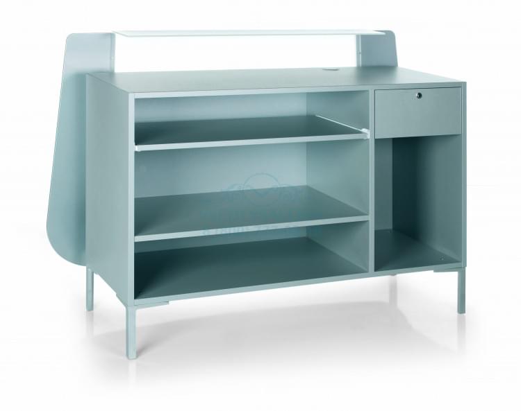 Стойка администратора. Фасад из белого оргстекла с подсветкой, тумба из дерева или ламината.