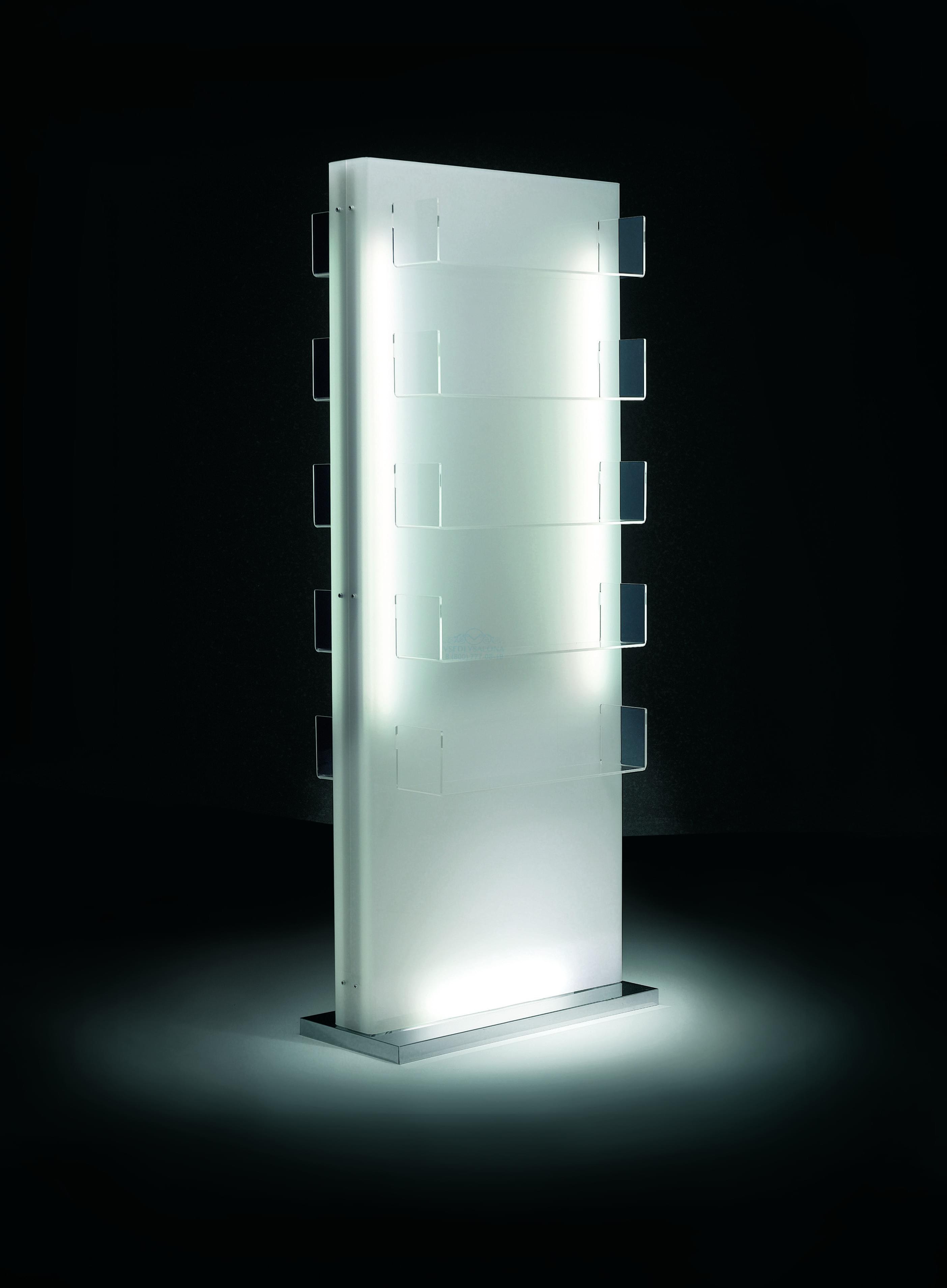 Двусторонняя акриловая витрина с подсветкой. По 5 полочек с каждой стороны, цвет белый.