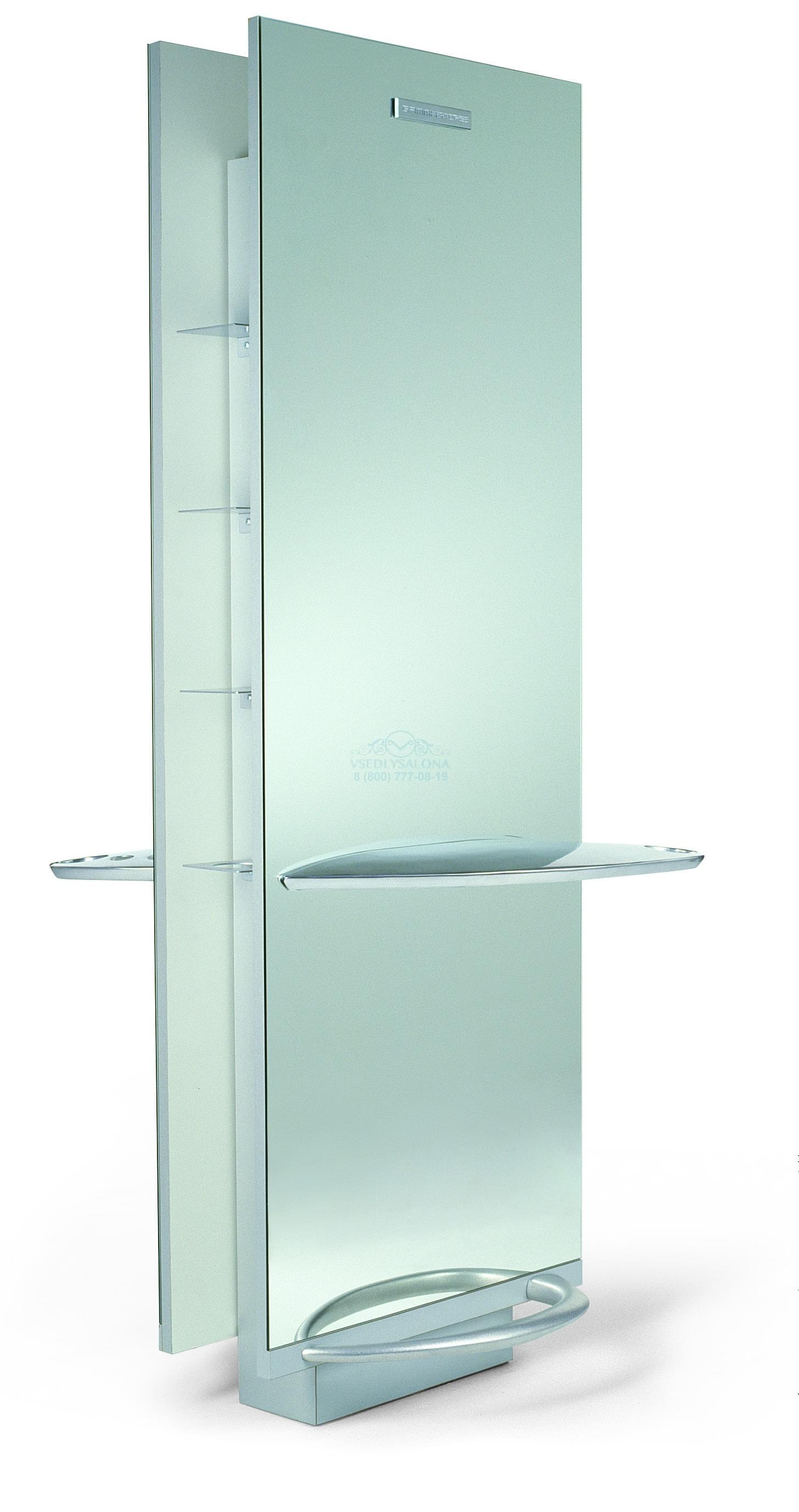 Зеркало парикмахерское, двустороннее, крепление к полу. Хромированная столешница и металлическая подставка под ноги, боковые полочки. Размер: 172х68х64