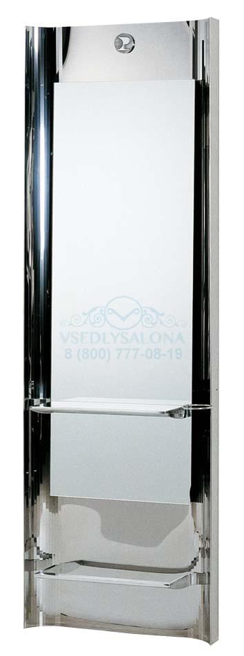 Зеркало парикмахерское в раме из нержавеющей стали, плоская хромированная столешница с фенодержателем, металлическая подставка под ноги. Крепление к стене. Возможен вариант с подсветкой.