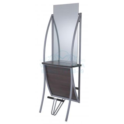 Зеркало парикмахерское, одностороннее, крепление к стене. Каркас выполнен из металла серого цвета, отделка и столешница из пластика. Комплектуется навесной подставкой под ноги. Цвет зеркала: серебро, другие цвета под заказ. Размер: (ВхГхШ) 188х30х69