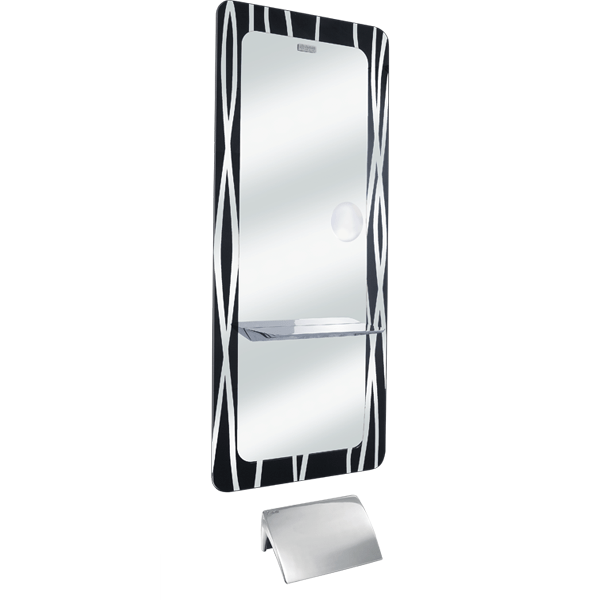 Зеркало парикмахерское одностороннее прямоугольной формы, крепление к стене. Рама выполнена из черного стекла с белым рисунком, металлическая столешница. Подножка для зеркала заказывается отдельно. Размер (ДхВхШ): 75х200х26